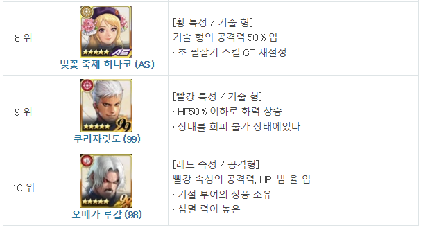 <게임> 킹 오브 파이터즈 올스타(KOF) 퀘스트 속성별 등급표(캐릭터)