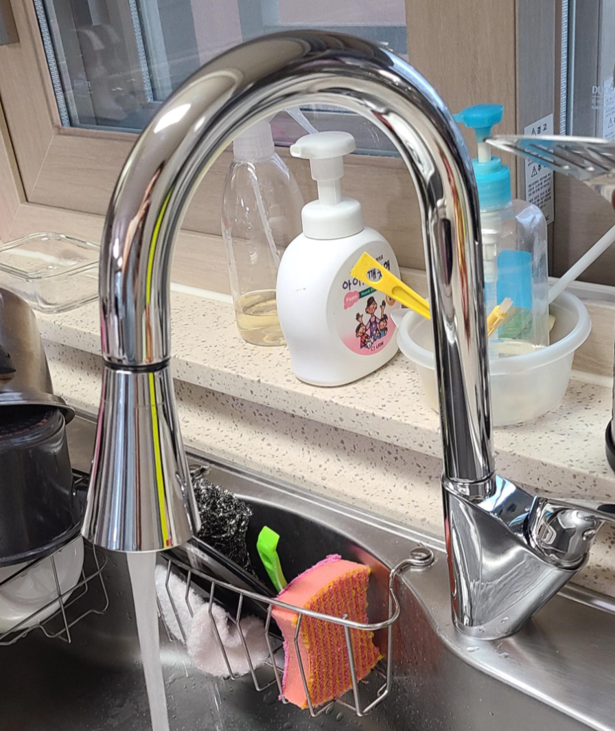 필자의 경우 수전으로 나오는 물을 발로 수위치를 눌러 On/Off 시키는 장치가 달려 있었습니다.