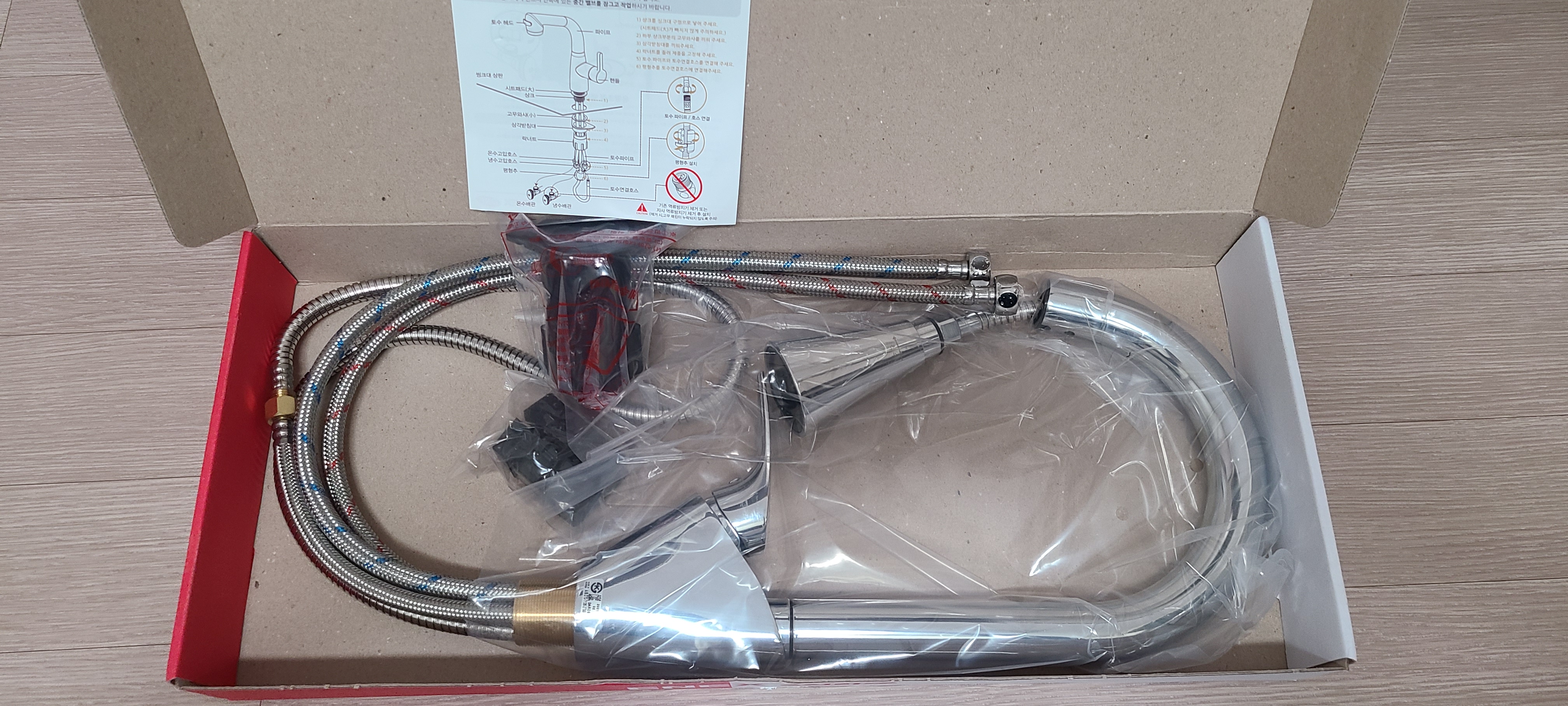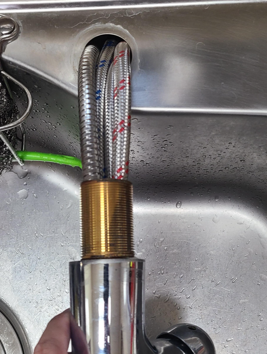 이제는 새로 구매한 수전을 분리한 역순으로 장착을 합니다. 먼저 수전을 싱크대에 끼우고, 호수들을