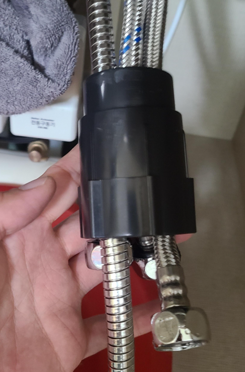 정수기를 사용하신다면 정수기 연결 호수 다음에 싱크대 수전의 냉수 호수를 연결하셔야 합니다.
