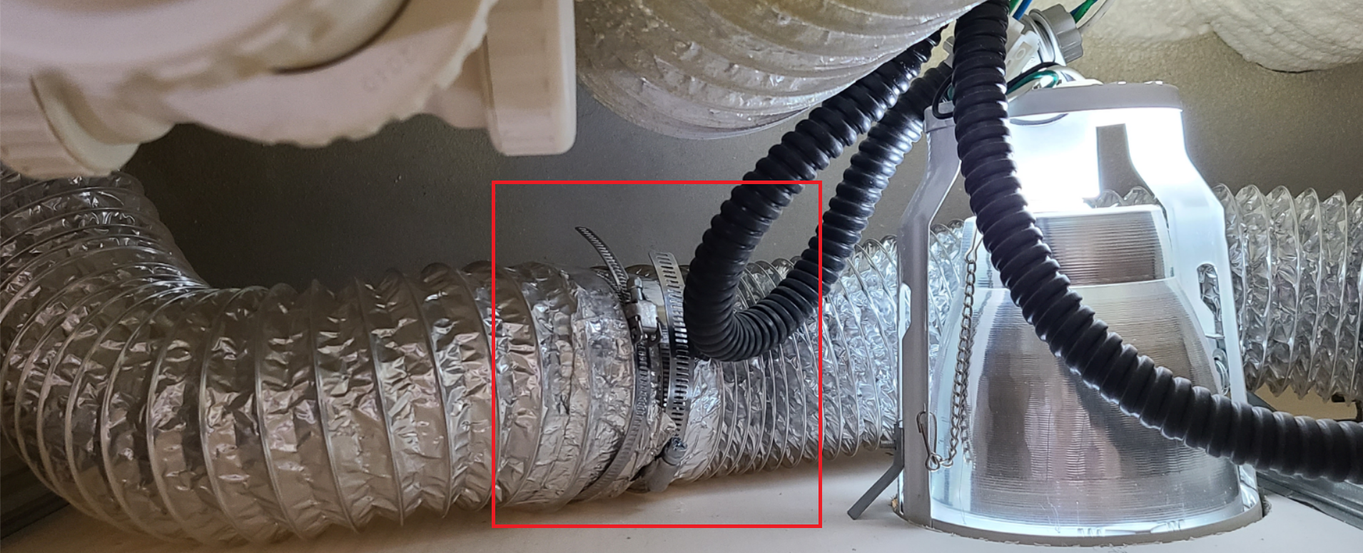 위 사진과 같이 메인 배관이 은박 테이프로 환풍기 연결 배관과 연결된 것이 분리 되어 있었습니다.