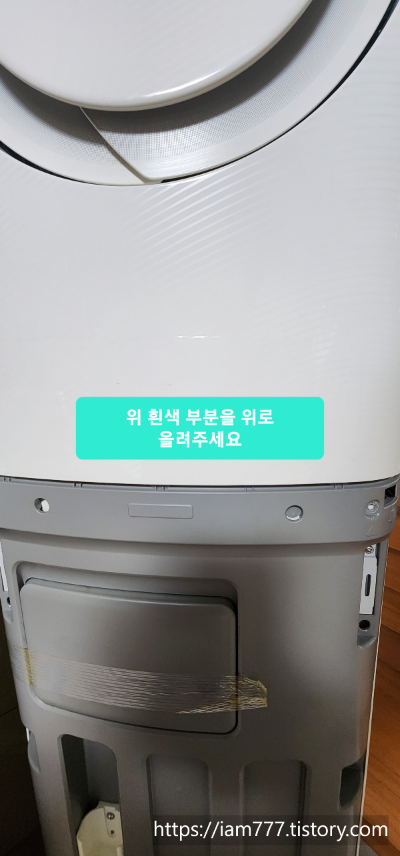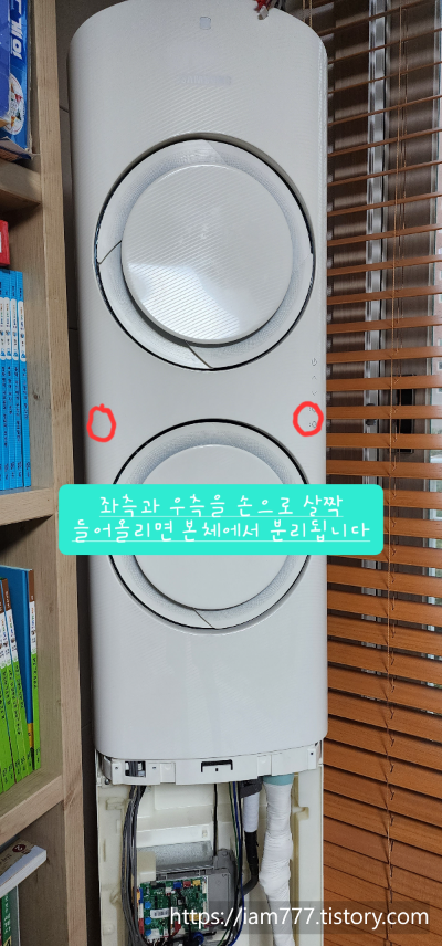 바람이 나오는 흰색 전면 모듈을 양손으로 좌우측을 잡고 살짝 올려 줍니다.