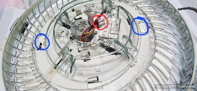# 원형부분만 분리가 되었으면 아래 파란 위치를 살짝 누르면서 돌려주면 투명 플라스틱과 안쪽 부품이 분리가 가능합니다.