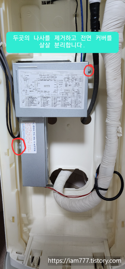 아래쪽 사진에 커버 두곳의 나사를 제거합니다.