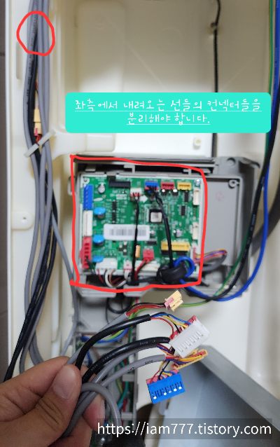 # 보드 박스 커버를 분리 후 좌측에서 내려오는 케이블들이 연결된 컨넥터를 분리 시켜 줍니다.