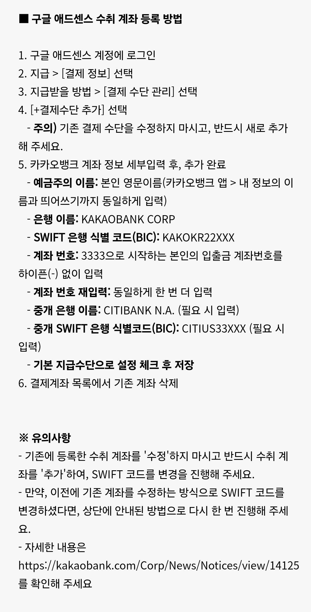 2023년 3월 29일 카카오뱅크 SWIFT 코드'가 변경되었습니다.